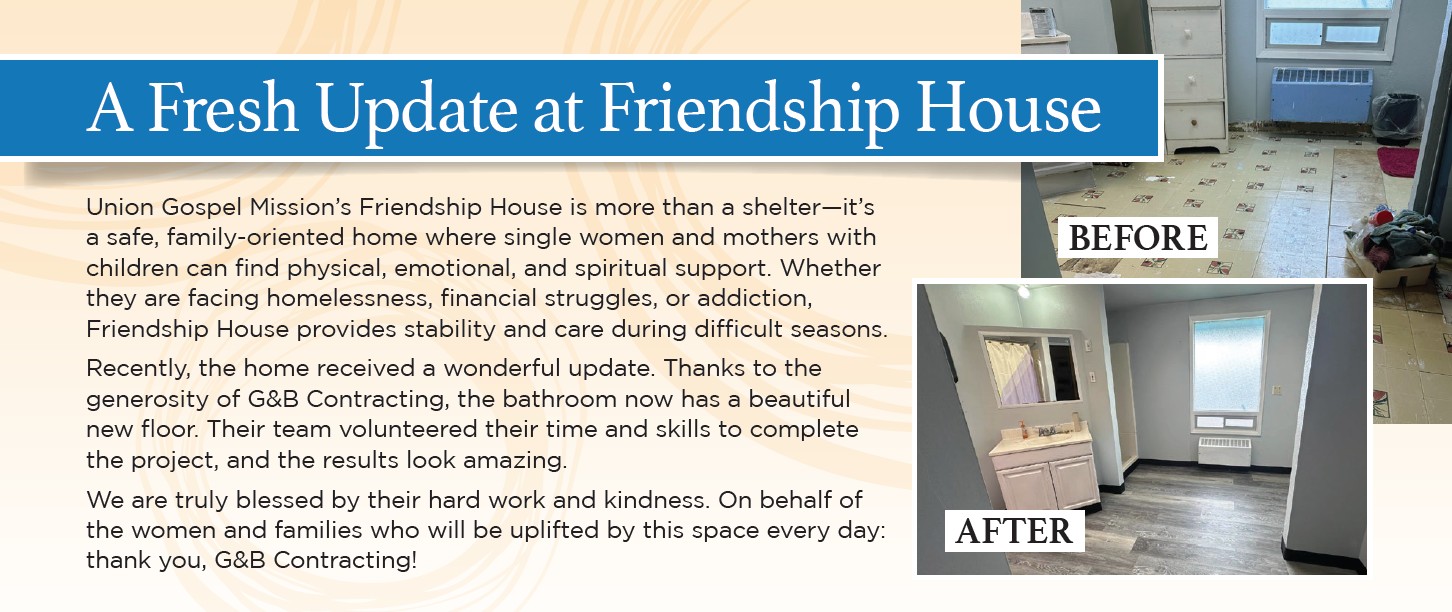 Friendship House provides hope and help for single women and mothers with children. Whether they are seeking shelter because of homelessness, addiction, or financial problems, women and children find the physical, emotional and spiritual support they need each year in our safe, family-oriented housing.