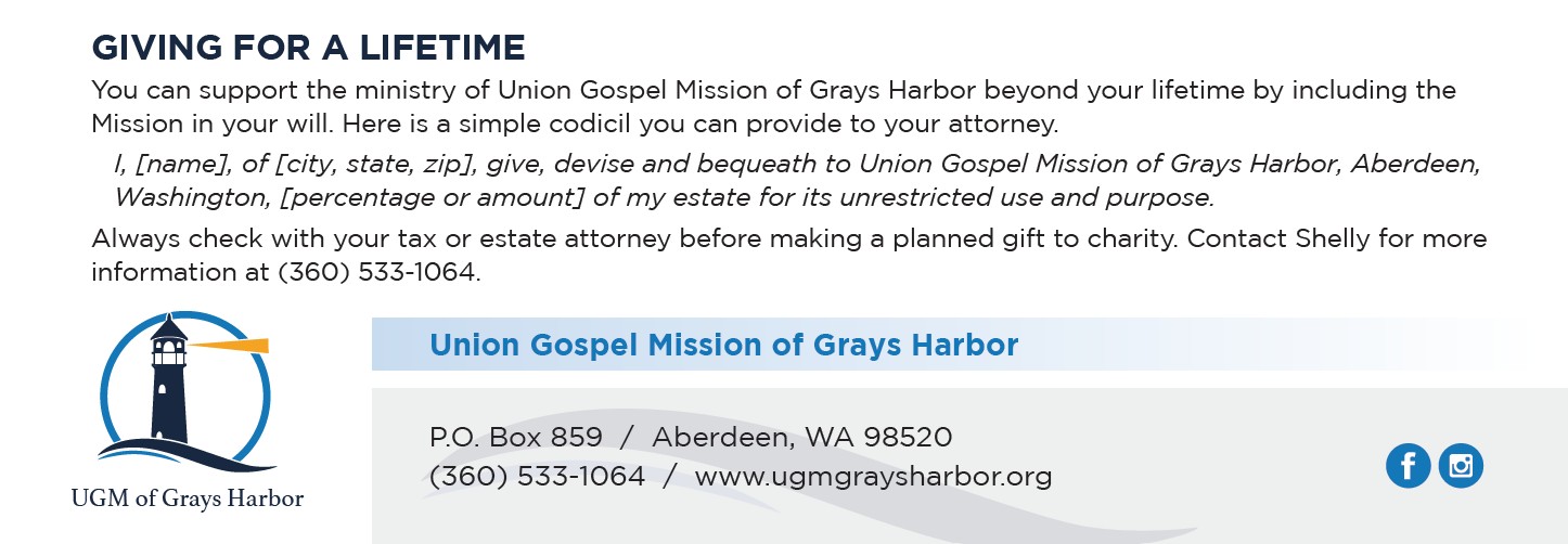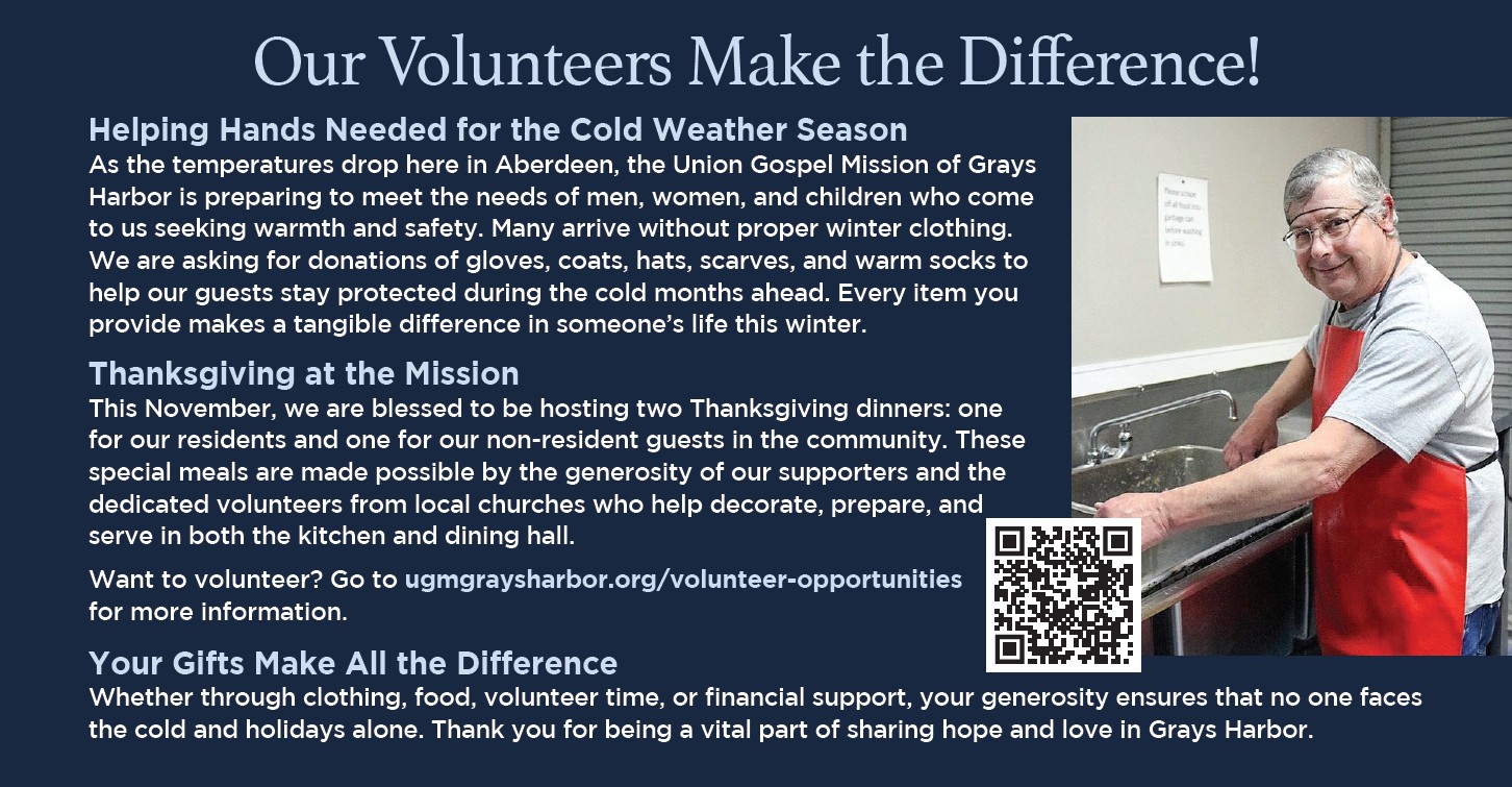 As the leaves fall and we enter this season of thanksgiving, Union Gospel Mission of Grays Harbor is reminded of how much your generosity means—not just right now, but in the year ahead.